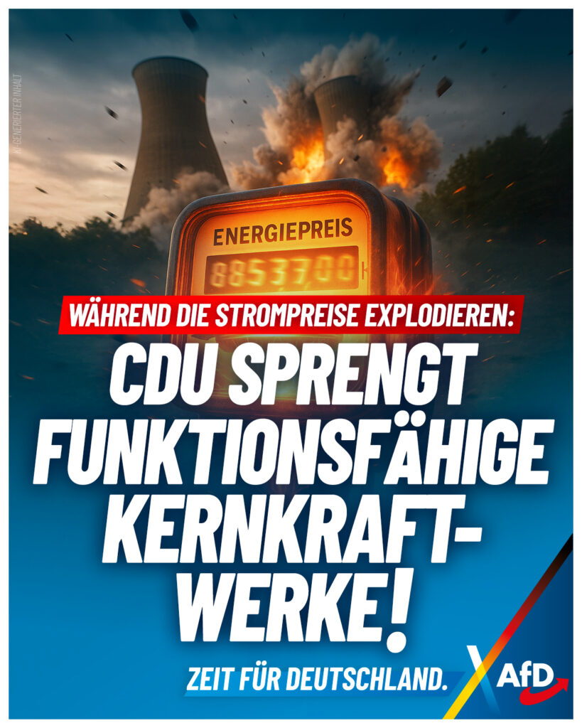 Die ohnehin hohen Strompreise in Deutschland steigen immer weiter und sind derzeit auf dem höchsten Stand seit sieben Monaten. Der Grund ist einfach: die völlig gescheiterte Energiewende der CDU. Jetzt im Herbst sinkt die Produktion aus erneuerbaren Energien, während der Verbrauch steigt. Während die Strompreise in die Höhe schießen, hat die Regierung nichts Besseres zu tun, als die Energie-Infrastruktur – und damit die Grundlage für unseren Wohlstand – in die Luft zu jagen. Am 25. Oktober werden die Kühltürme des Kernkraftwerks Gundremmingen gesprengt.